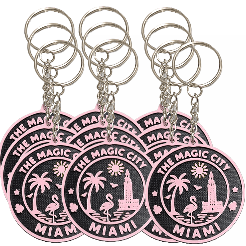 Bold and playful, this black and pink keychain brings a fresh twist to the Magic City. The vibrant pink contrasts beautifully against the deep black base, giving off retro Miami vibes with a modern edge.